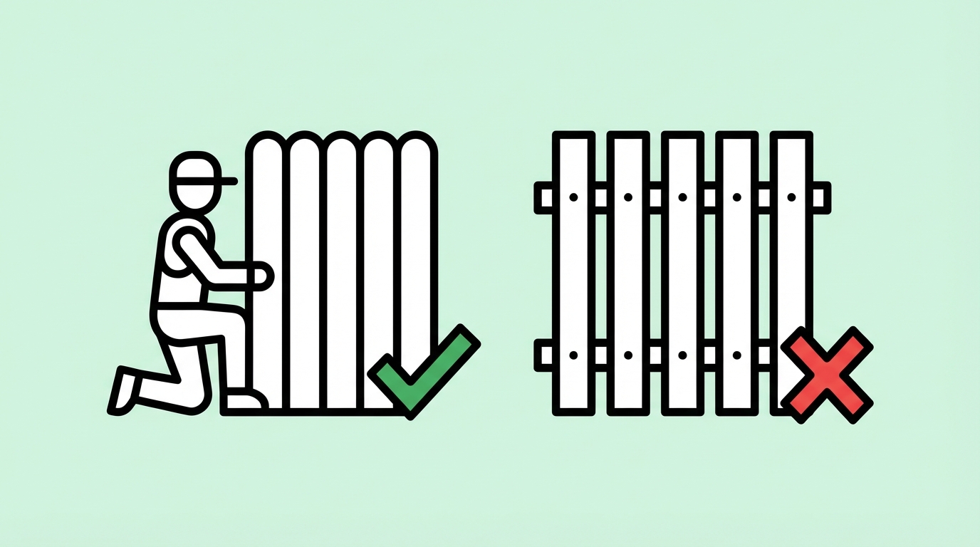 Een om-en-om schutting, waarbij de planken afwisselend aan beide kanten van de latten worden bevestigd, ziet u vaak in Nederlandse tuinen. Helaas heeft dit type schutting nauwelijks effect op geluidsdemping. De openingen tussen de planken laten geluidsgolven namelijk gewoon door, waardoor het geluid van de buitenunit vrijwel ongehinderd de erfgrens bereikt.